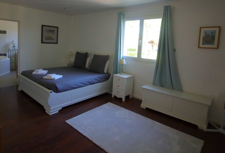 Large deluxe bedroom with king bed and optionally extra beds and an en suite bathroom with bath and separate shower.